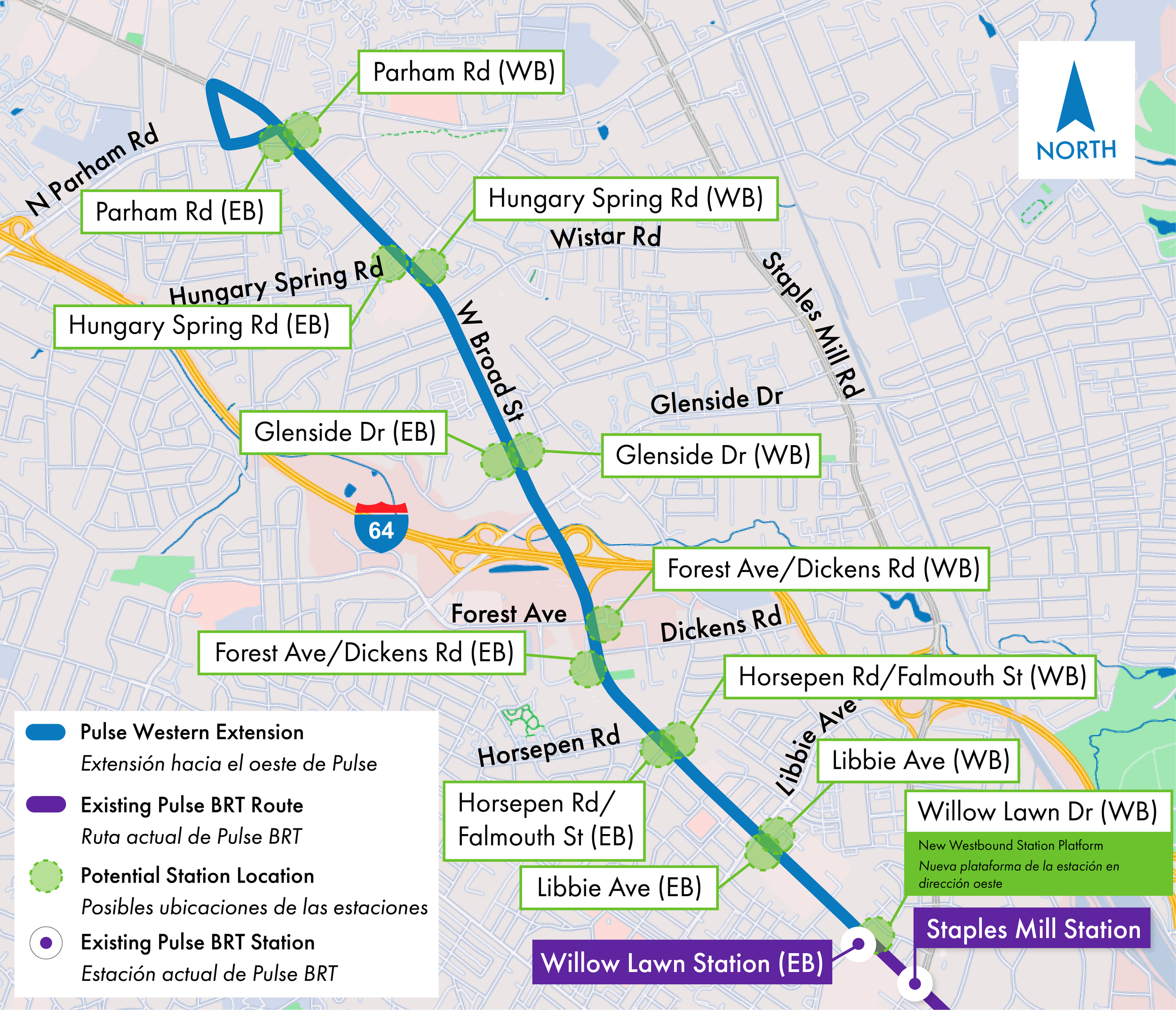 With the Western Extension project, GRTC is extending the Pulse westward from the Willow Lawn Station. The extension corridor is approximately four miles in length and connects several major commercial areas.